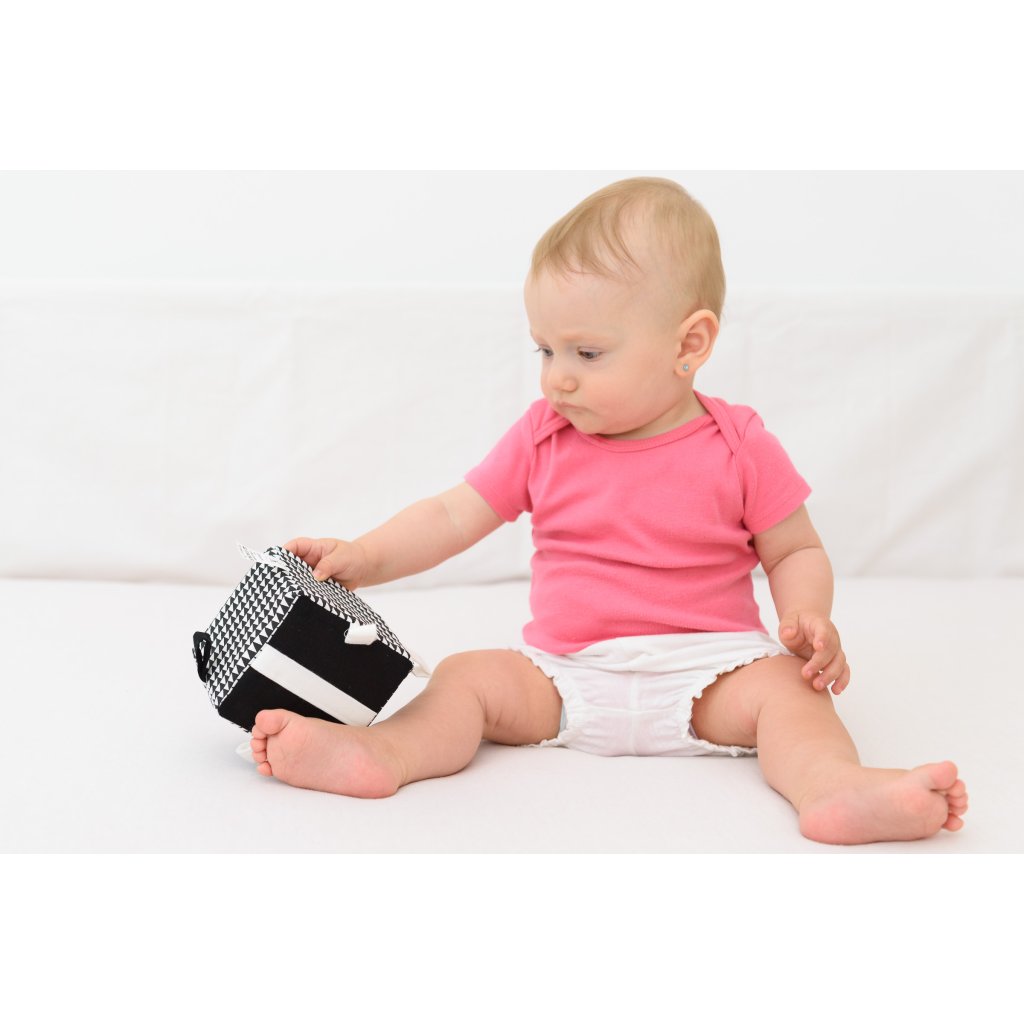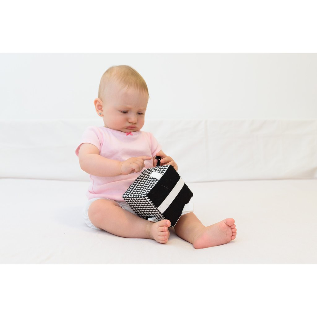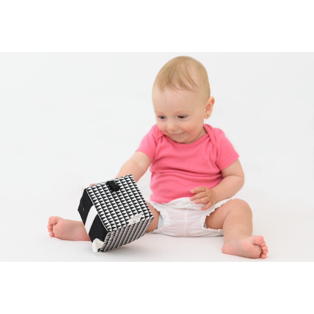Hmat – striedanie hladkých povrchov bavlny na stranách kocky a vyčnievajúce ušká pomáhajú k stimulácii hmatu.